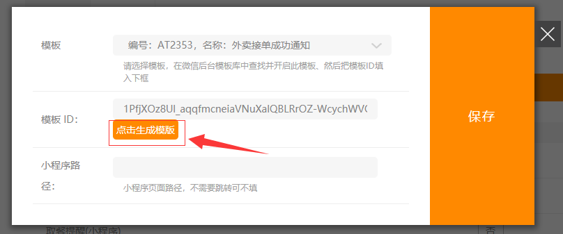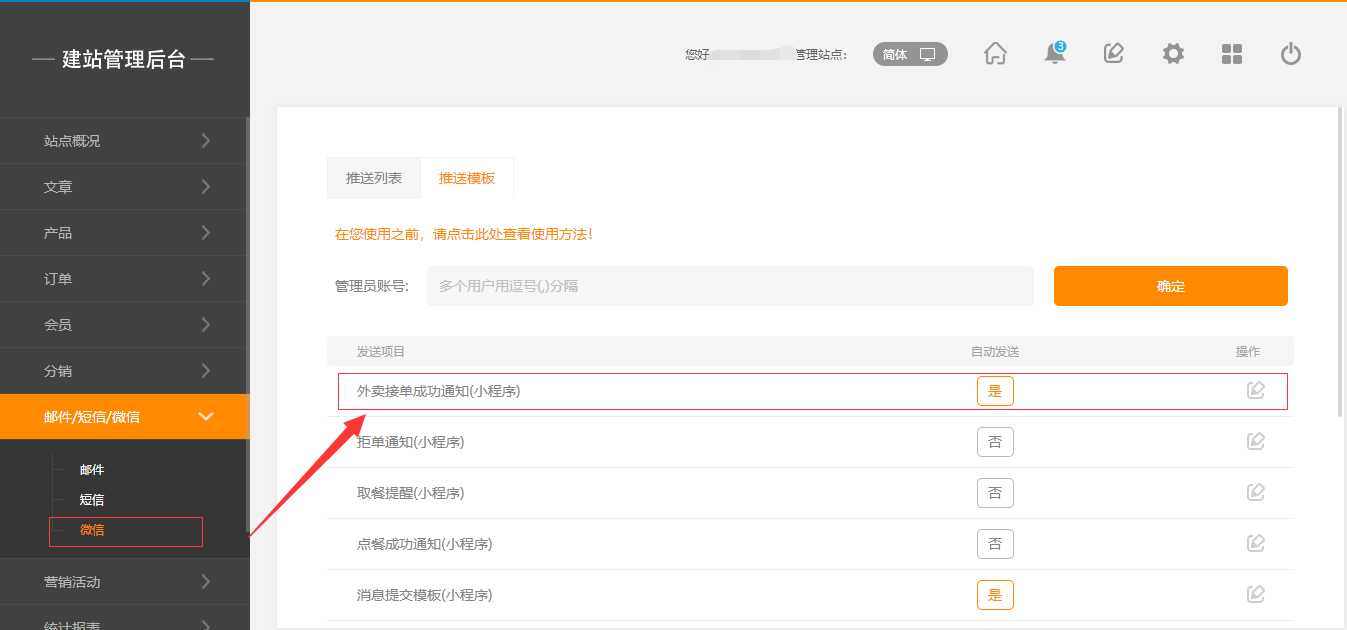 1.后台点击“邮件/短信/微信”-“微信”,选择推送模板-外卖接单成功通知,点击编辑-“点击生成模板”,然后点击确认,开启自动发送即可,如图所示: